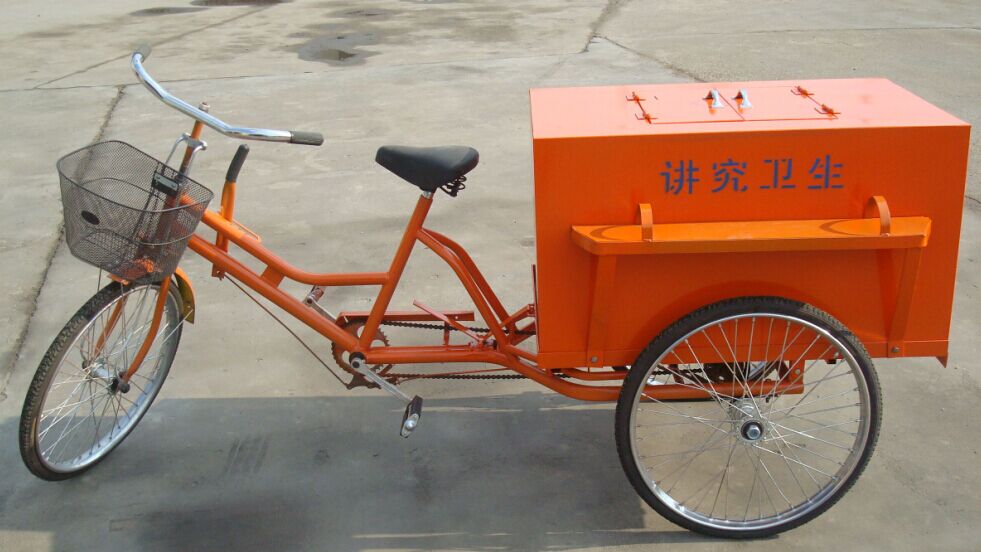 箱子整體采用1.0mm鍍鋅板制作,車架采用名牌24型雙梁底座加重自行車,使用輕便快捷,大大提高了環衛工人的勞動強度。