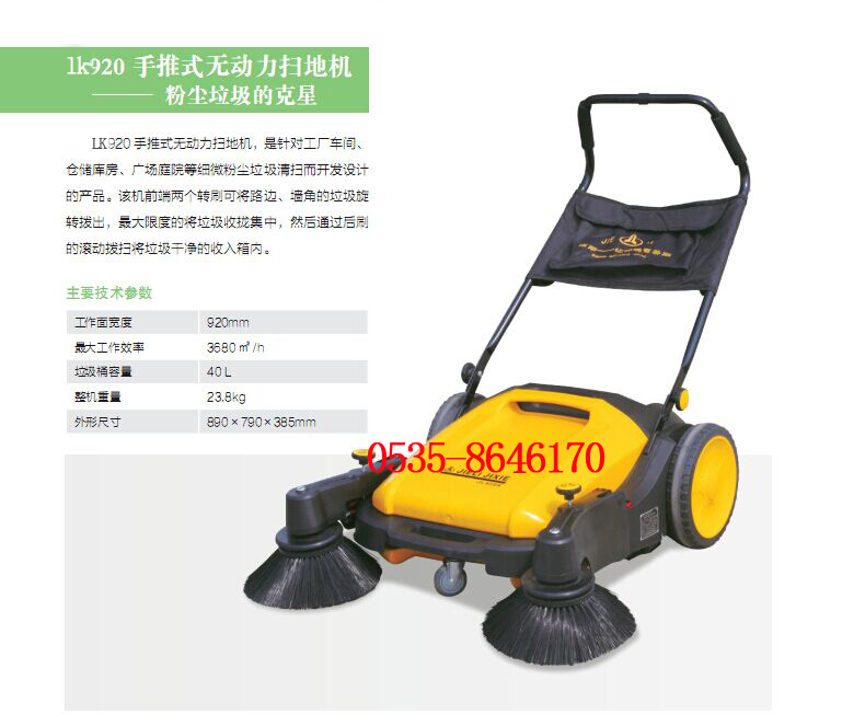 920無動力掃地機本公司研制的新一代的環衛保潔工具。920無動力掃地機結構設計精巧,整機無需電力,只需推著步行便可將垃圾輕松回收到垃圾箱內。前后毛刷可根據地面以及垃圾的情況,隨時進行高度調節,使之達到無功損耗和最佳清掃效果。扶手采用活動可調設計,既能適應人不同身高的需求,又可折疊直立存放,節省空間,便于儲運。垃圾箱裝卸方便,封閉嚴密?沙休d酸,堿,鹽,油垢等腐蝕性垃圾。主要部件采用工程塑料制造,抗腐蝕,耐老化,不變形。轉動部位采用封閉式精密軸承,整機運轉靈活,工作省力。 920無動力掃地機造型新穎,使用方便,綠色環保,節能高效,清掃效率是傳統人工的4-6倍,特別適合清掃街道,小區,庭院,學校,醫院,車站,倉庫以及大型活動場館等不易使用動力型輕松設備的場所結力無動力掃地機符合國家節能環保的發展方針,順應時代發展,使繁重的清掃工作變的省時省力。 結力無動力掃地機的特點: 1.不需能源-手推行走即可完成清掃工作 2.綠色環保-無噪音,無排放,適合任何靜音無污染的場所 3.省事省力-是傳統人工效率的6倍以上 4.經久耐用-整機采用工程塑料制造,抗腐蝕,耐老化,不變形 5.儲運方便-手提把手方便搬運,直立存放,節省空間